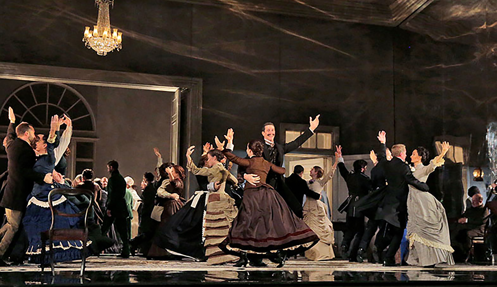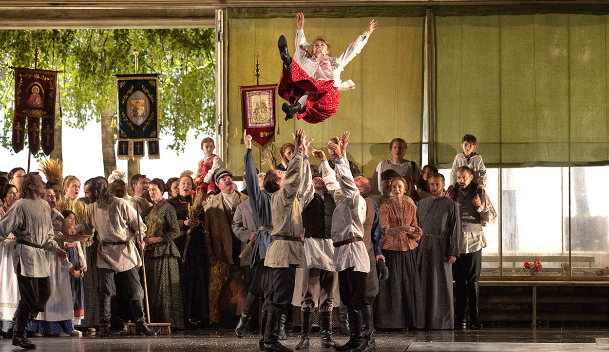 Pushkin ofrece una visión general de la antigua sociedad rusa alrededor de 1820, que la partitura original de Tchaikovsky divide claramente en sus tres actos: desde los rituales atemporales de la vida rural hasta la nobleza campestre con sus problemas y placeres y, finalmente, la deslumbrante aristocracia imperial de San Petersburgo. La producción del Met sitúa la acción a finales del siglo XIX, en torno a la época del estreno de la ópera.